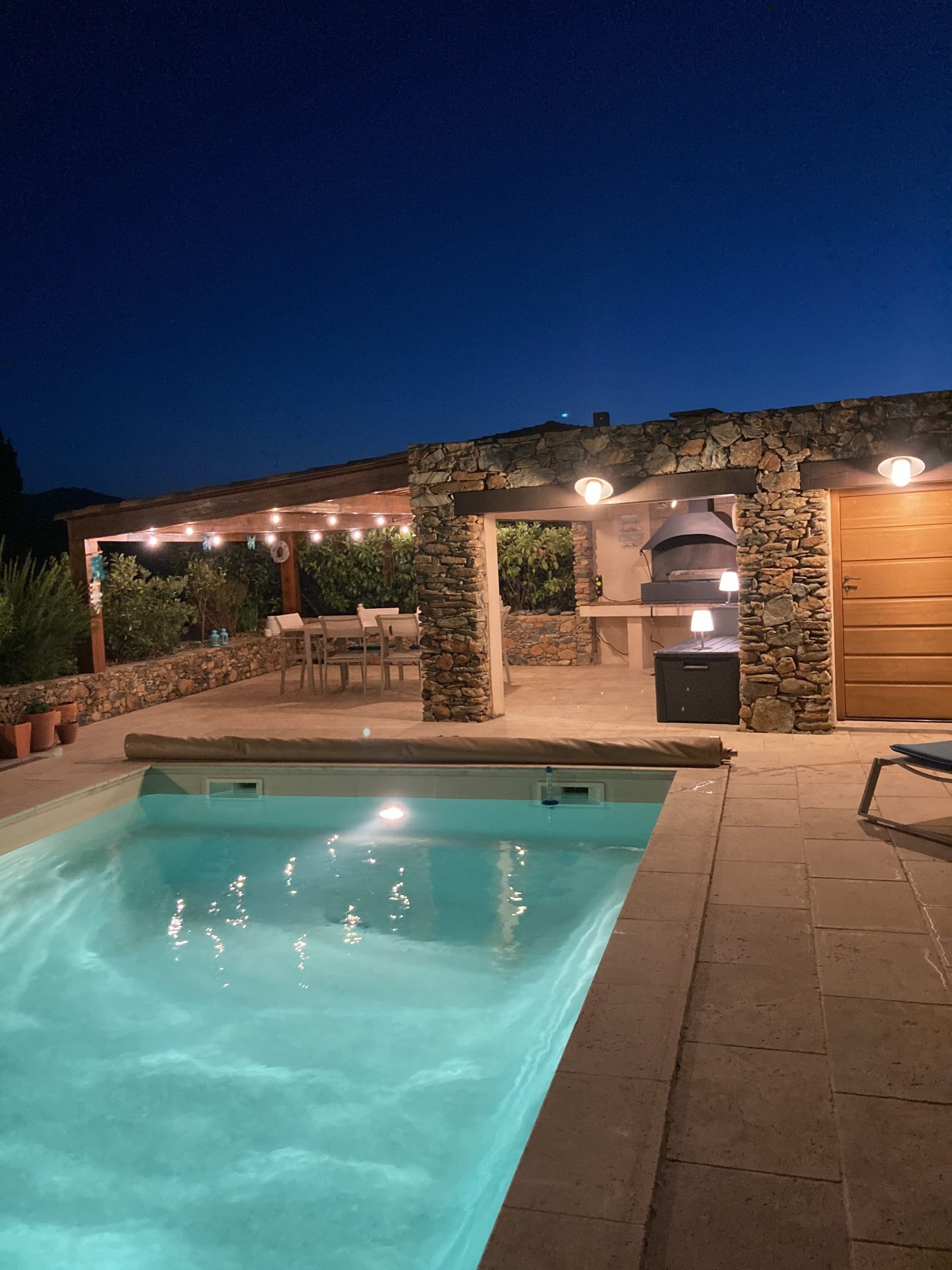 Cette terrasse est couverte et dispose d’une cuisine d’été (plancha et frigo) pour savourer vos grillades, à l’ombre aux heures chaudes ou le soir sous la guirlande de lampes.