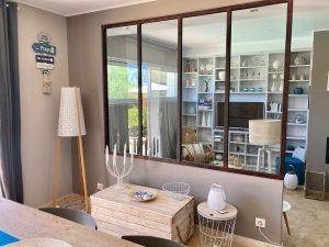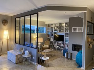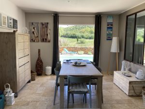 - Elle donne directement accès à la terrasse, à la piscine ainsi qu’à la pelouse située sur le côté de la maison